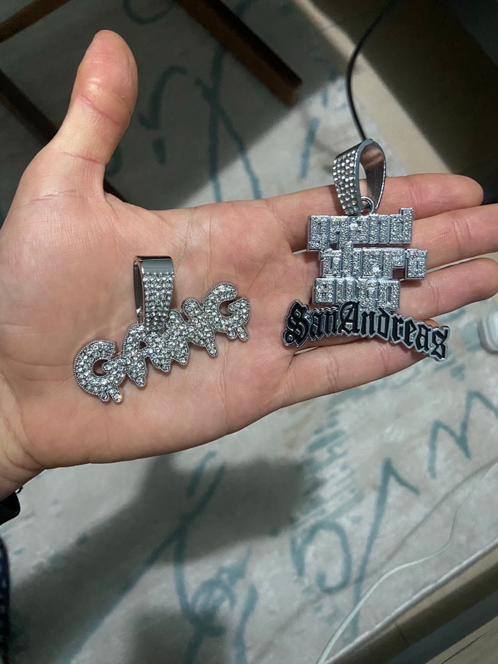 Parlak detaylara ve punk tarzı yazılara sahip, gold ve gri renklerde sokak stili erkek küpeleri. Rock punk havası için uygun.