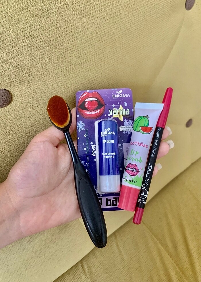 Bir adet fondöten fırçası , bir adet lip balm , 1 adet lip scrub , 1 adet flormar dudak kalemi. Toplu fiyattır. Fiyat sondur direkt ilanı satın alabilirsiniz. Ürünler sıfır paketlidir