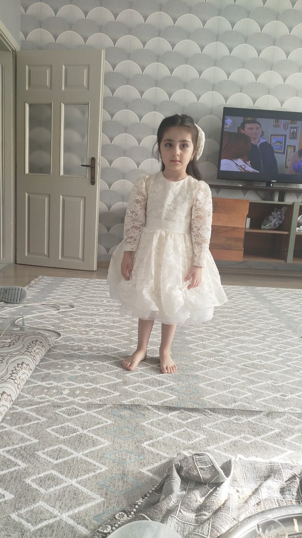 Krem renkte, çocuklar için uzun kollu, tekne yakalı, nakışlı kelebek detaylı ve fırfırlı, sentetik kumaştan yapılmış, modest ve normcore tarzda dar kesim elbise.