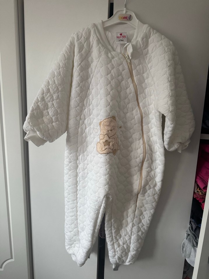 Beyaz renkli, fermuarlı bebek tulumu. Yuvarlak yakalı, yumuşak kapitone dokulu ve önünde küçük ayıcık detayı bulunur. Sıcak tutar. ❄️ 4 yaş uyku tulumu kışlık