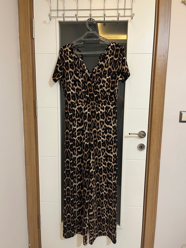 Kahverengi leopar desenli, ve V yakalı uzun tulum İnce askılı ve yumuşak kumaşı kaliteli günlük kullanım için uygundur. Sıfır hiç kullanılmamıştır