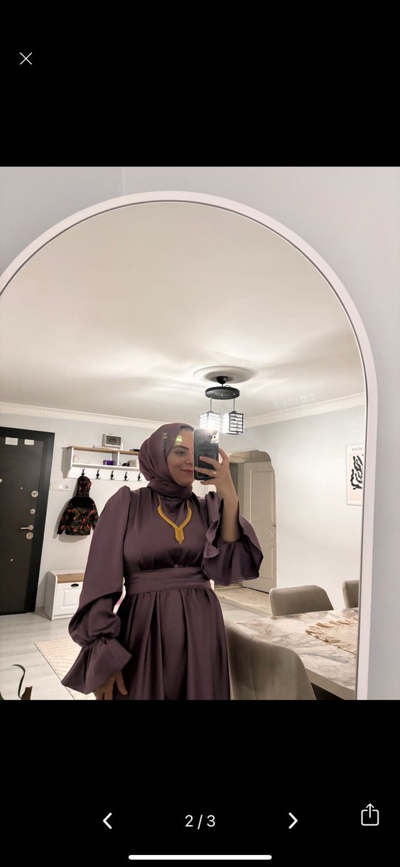 Uzun kollu, yüksek yakalı ve dökümlü tasarıma sahip, etnik desenli mor tonlarında, bol kesim ipeksi kumaş elbise.