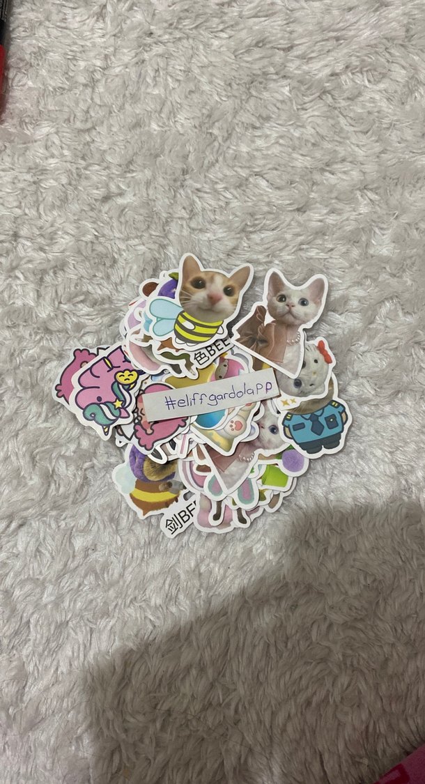 Pastel renklerde çeşitli kedi tasarımları ve eğlenceli çizimler içeren çoklu sticker seti. '#eliffgardoaP' yazılı bir sticker da bulunur.