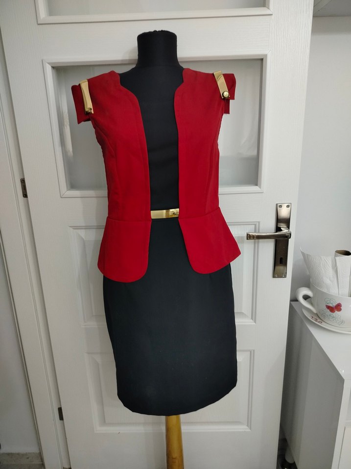 kol alti 42 boy 94 Kolsuz, kırmızı baskılı üst kısmı ve siyah eteğiyle kemerli, kesik yaka ofis elbisesi. Düzenli kesim ve çağdaş tarzıyla iddialı iş kıyafeti.