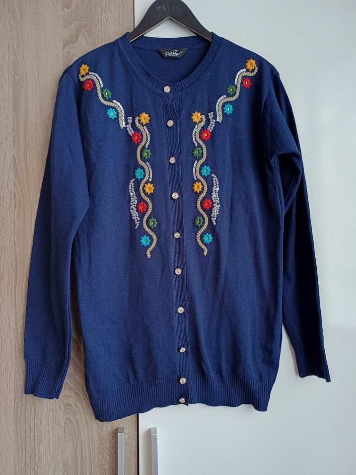 Renkli nakış detaylı, düğmeli mavi triko hırka. Uzun kollu, bisiklet yaka ve bol kesim midi boyda, bohem tarzı yansıtıyor standart ölçüleri boy 70 omuz 40 Tek yön göğüs çevresi 54