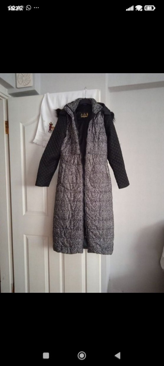 40 beden uzun kadın mont. şapkalı ve şapkasinin ucu tüy detaylı. sapkası dügmeli cıkarılabilir. fermuarlı ve fermuarı sorunsuz. düğmeleri eksiksiz. şişme mont gibi biraz. çok şık bir mont. ve sorunsuz. boyu:118 cm. iki kolaltı arası:47 cm #tesettürmont #40bedentesettürmont #40bedenuzunmont #uzunmont
