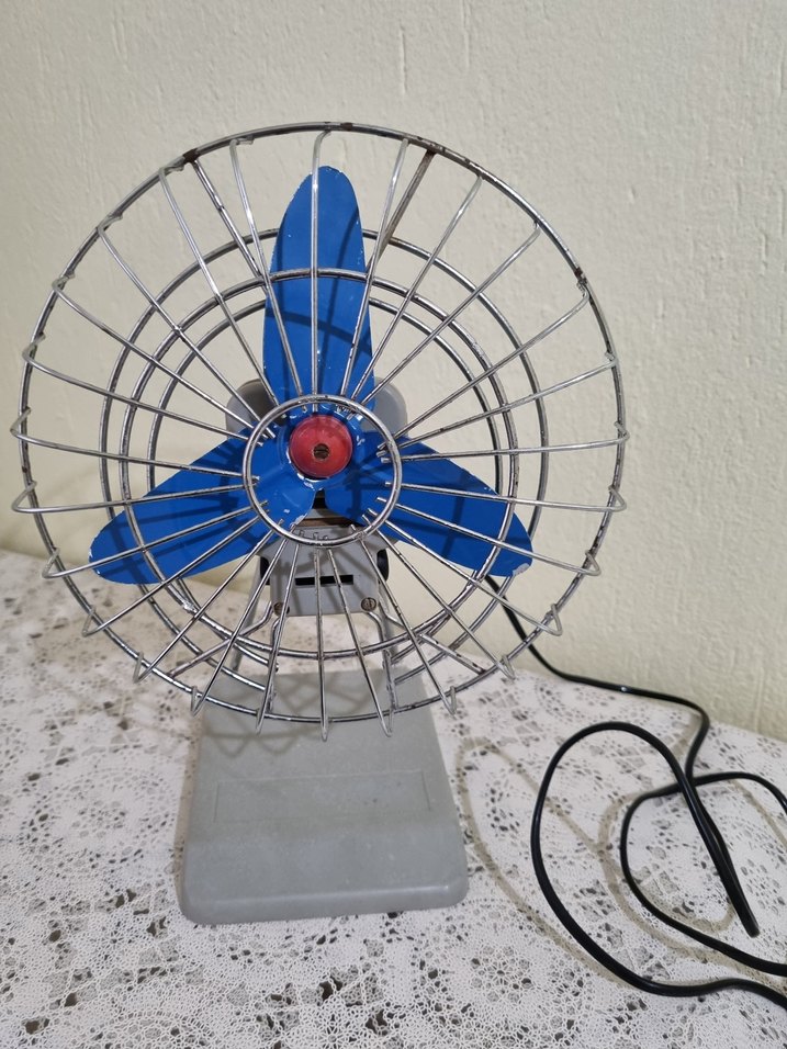 Mavi kanatlı, gri metal kafesli masa fanı, sağlam tabanıyla kişisel serinlik sağlar. Güç kablosu mevcuttur. ️Sadece elektrik geldiği halde fanı dönmüyor. Fiyat uygun tutuldu.Bakım görmesi lazım