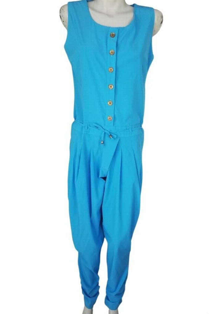 Düğmeli ve kolsuz, yuvarlak yakalı uzun kadın tulumu. Bol kesim,hafif şalvar havalı,bağcıklı bel ve canlı mavi renkte, rahat sentetik kumaştan üretilmiştir. Sadece 1 kere tertemiz kullanıldı..Hicbir sorunu yoktur.Çok hoş ve dikkat çekici bir giyindim,bu fiyata kaçırmayın..