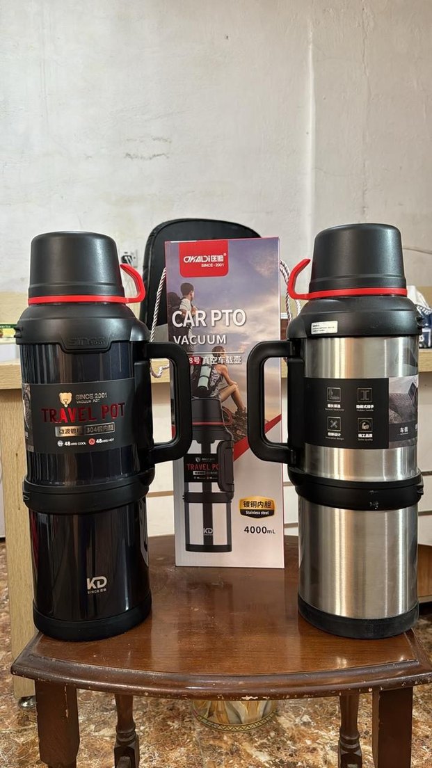 4000 ml kapasiteli siyah termosu, vakum izolasyonlu, içecekleri sıcak veya soğuk tutar, sağlam kulplu ve güvenli kapaklıdır.