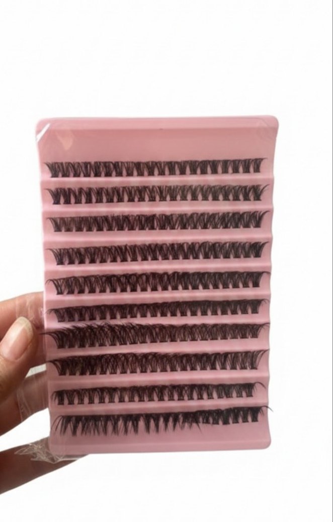 Açık pembe renkte yapay kirpik topları, uygulama kolaylığı için pembe tepside sıralanmıştır.