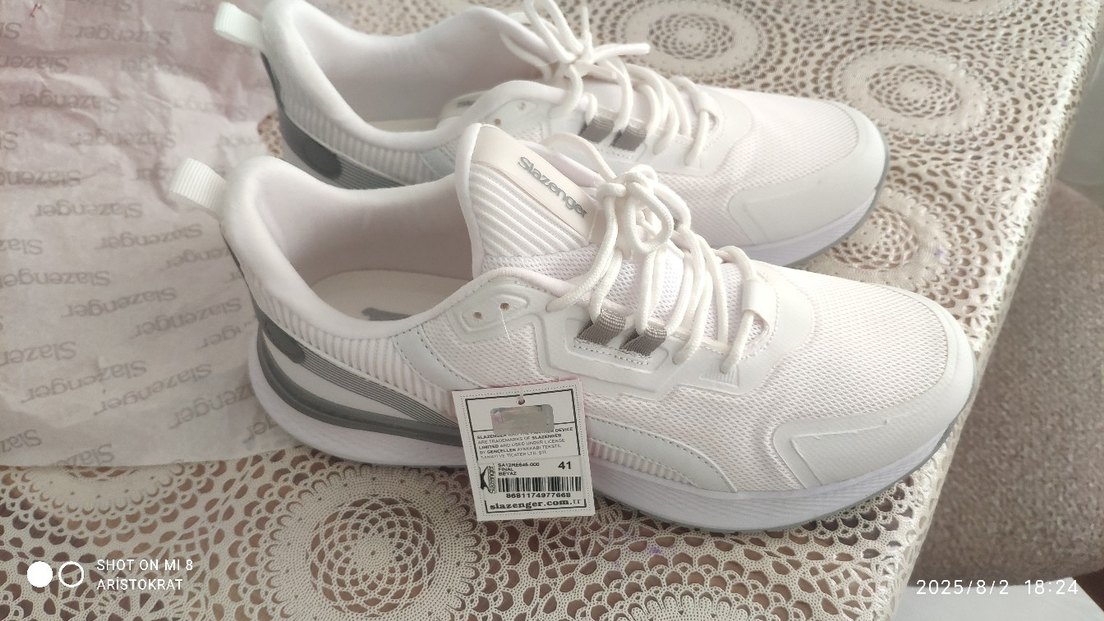 Beyaz bağcıklı, gri desenli slazenger spor ayakkabı. Rahat kauçuk malzemeden üretilmiştir.