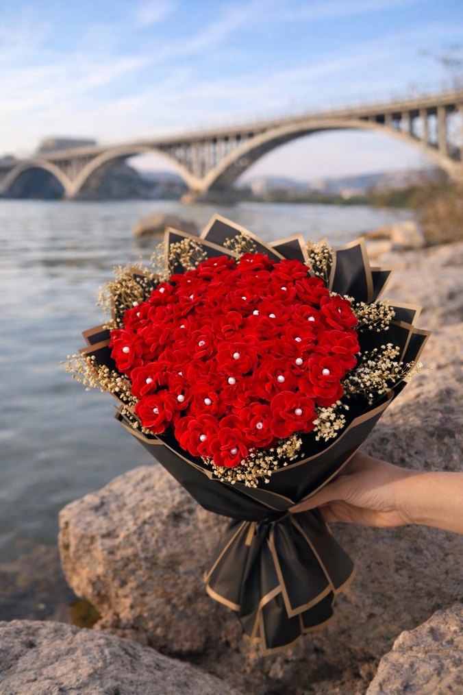 Kırmızı güllerin ve beyaz detayların yer aldığı, şık siyah kağıda sarılmış kadın parfümü buketi.