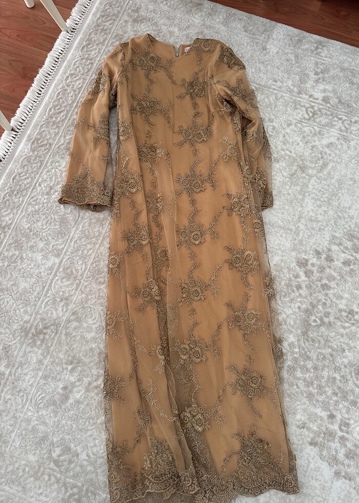 42-44 beden özel dikim kadın karamel renk abiye elbise