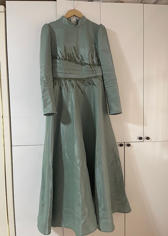 Su yeşili abiye Üzerindeki süsler sıcak ütü ile yapışmaktadır