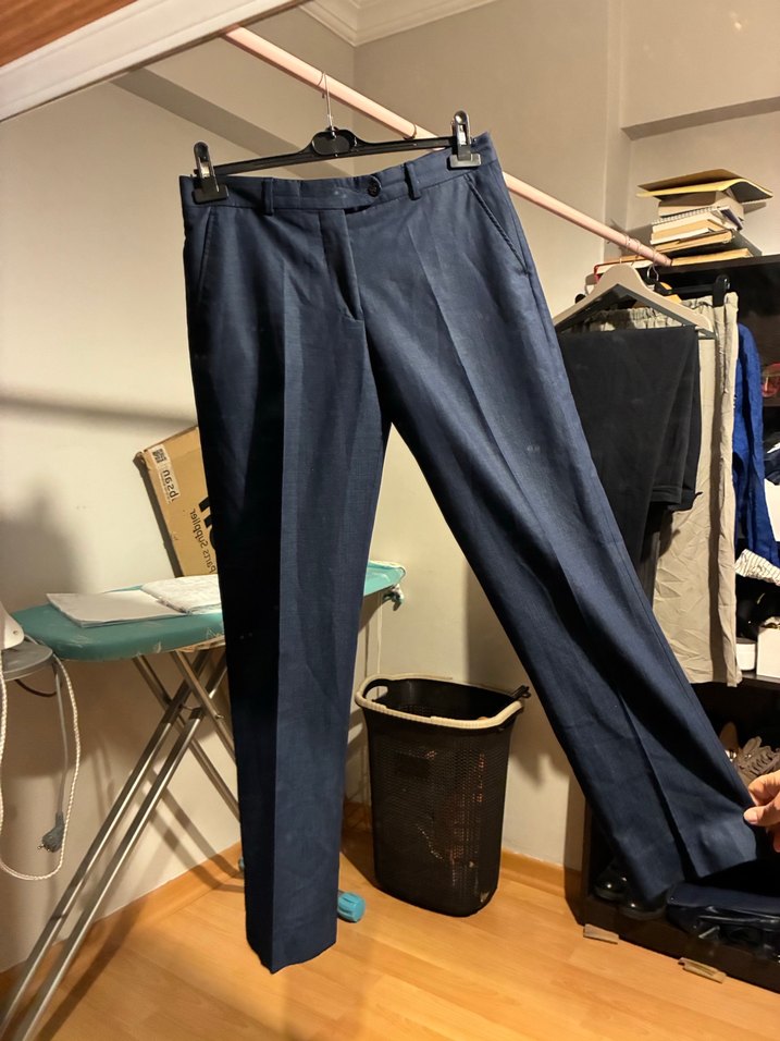 Mavi erkek denim kumaştan, normal boy ve regular fit kesime sahip, tokalı ofis pantolonu. Normcore tarzda, desen içermeyen şık tasarım. 98 cm boyunda bel 85 santim basen 100 santim belden ağa kadar olan kısım önden 25 arkadan 30 santim