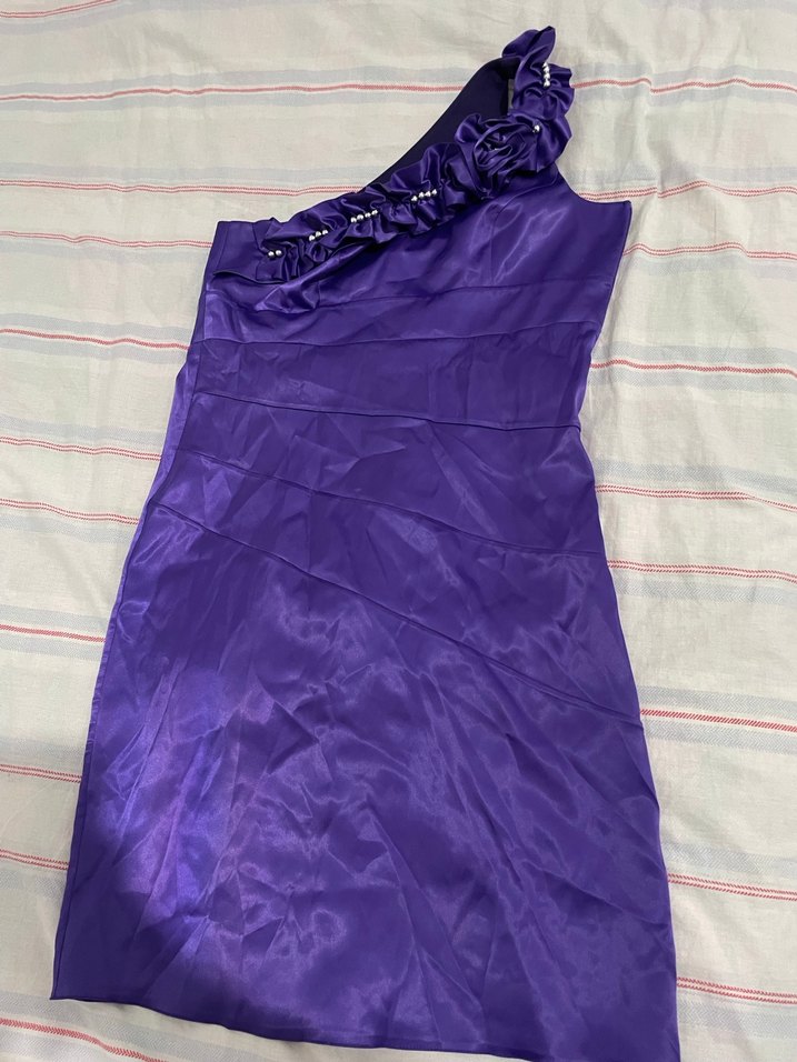 yandan fermuarlı tek omuzlu mor elbise