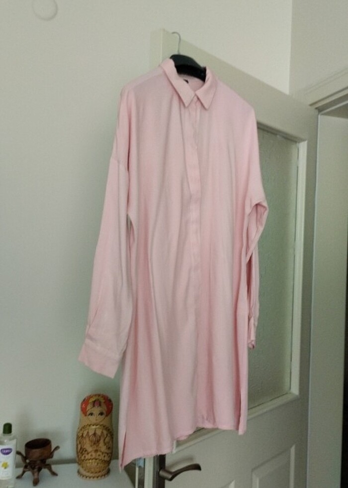 Pudra rengi uzun kollu yandan yırmaçlı tunik. Az kullanıldı yeni gibi, pamuklu yumuşacık kumaşı var iç göstermiyor. Boyu 86 cm koltuk altlarından 60 cm