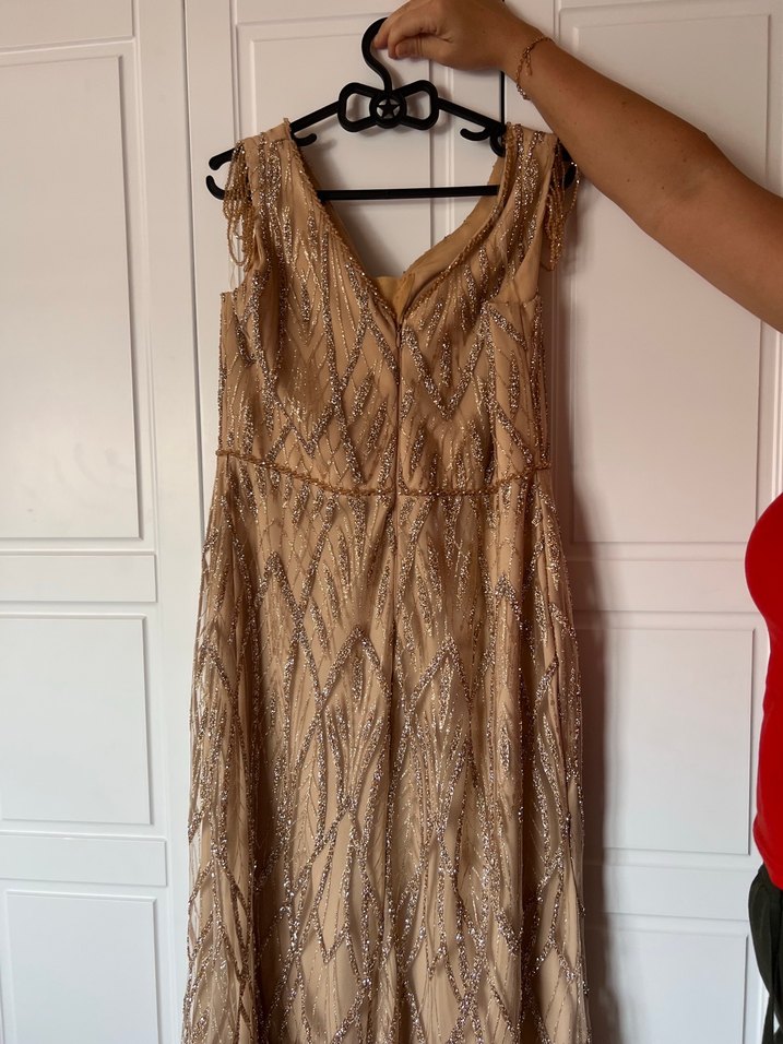 42 beden uyumlu Gold V Yaka Uzun Abiye Elbise