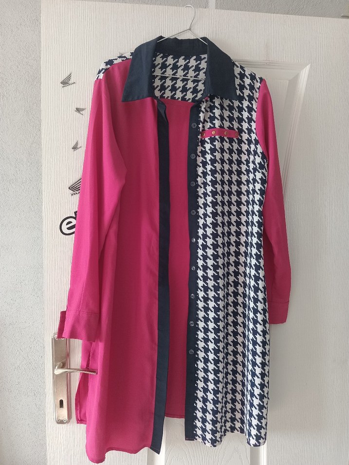 Uzun kollu, pembe renkli, bir tarafı renkli desenli, düğmeli ve yakalı kadın tunik. Sentetik kumaştan, trend günlük kullanım için uygun.