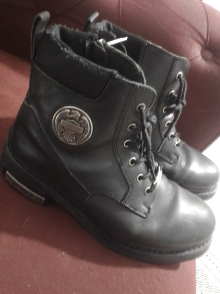 42 numara,deri, dikişli,orjinal,seri numaralı, orjinal erkek Harley Davidson bot.Ürünün çatlağı,yırtığı yoktur.Yalnızca iç taban kısımlarında deformasyonu vardır.Bu nedenle de ürünün fiyatını uygun yazıyorum.Yakından resimlerini çektim zaten.