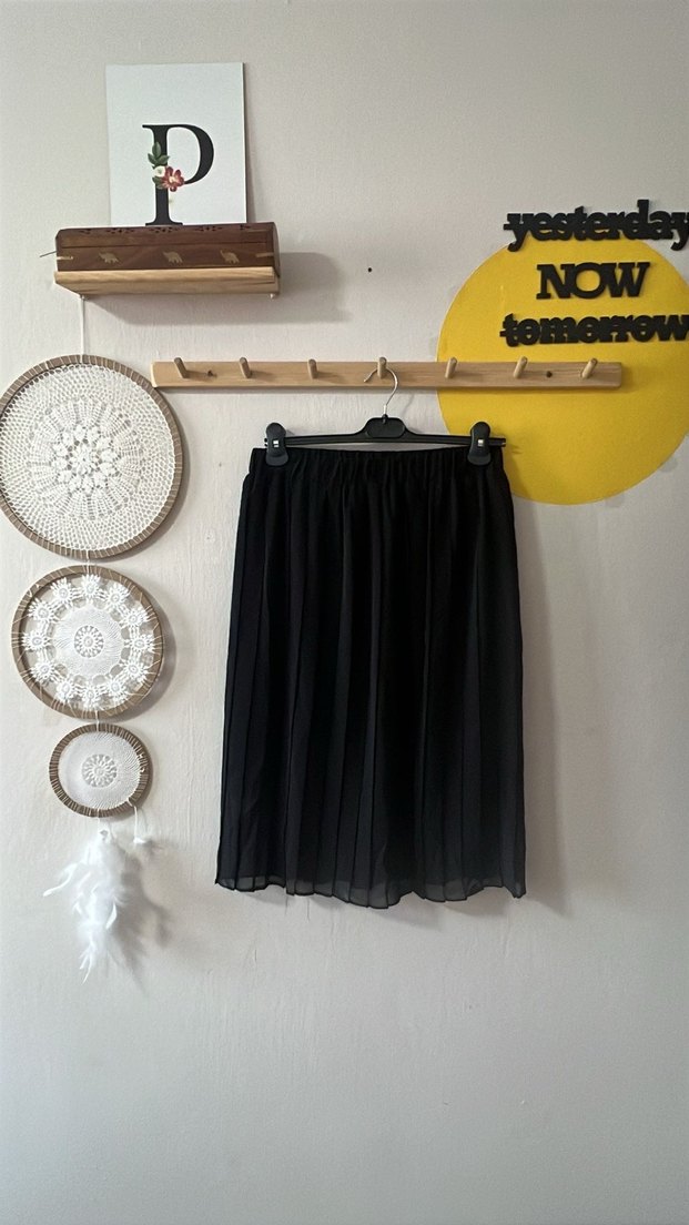 siyah pileli şifon etek 42 beden | Bel: 40 cm (50 cm’e kadar esner) | Dış boy: 68 cm | Astar boyu: 50 cm ℹ️ Etiketi çıkarılmış ancak hiç giyilmedi. Üst kısmı şifon pileli, içi astarlı olduğu için iç göstermeden rahat bir kullanım sağlar. ⚠️ Ürünlerim farklı şehirlerden kargolanmaktadır. Lütfen danışmadan ürün birleştirme veya toplu alışveriş yapmayınız.