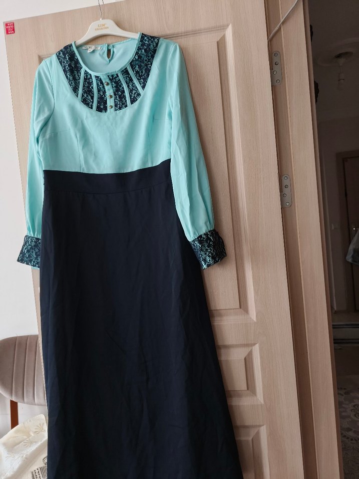Bu uzun turkuaz elbise, uzun kollu ve yuvarlak yakalı, bol kesimdir. Nakışlı drapeli detaylar yakada ve manşetlerde vintage tarzı sunar. Yumuşak sentetik kumaştan üretilmiştir.