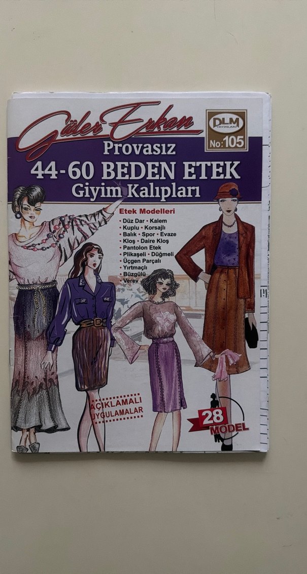 44-60 beden arası düz, kalem, kloş, piliseli gibi 28 farklı etek modeli ve açıklamalı uygulamalar içeren giyim kalıpları kitabı.