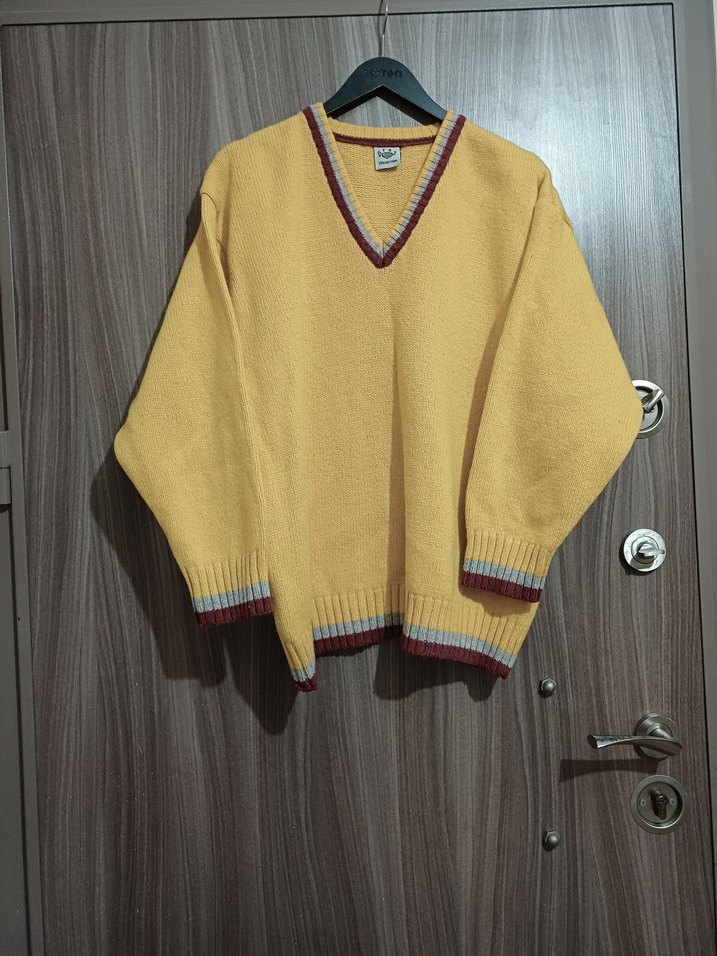 44 beden Bu bol kesim Erkek kazak, örgü dokusu, uzun kollu ve V yaka özelliklerine sahiptir. Pastel sarı renkte, çizgili ribana detaylıdır, rahat sokak stiline uygundur. ölçüleri boy 71 omuz 56 Tek yön göğüs 67 tek yön