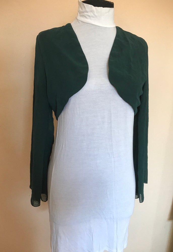 Fitted kesim, uzun kollu, askısız yakalı ve drapeli kız kadın bolero Düz yeşil Şifon kumaştan, çağdaş ve sade tarzda. İspanyol kol