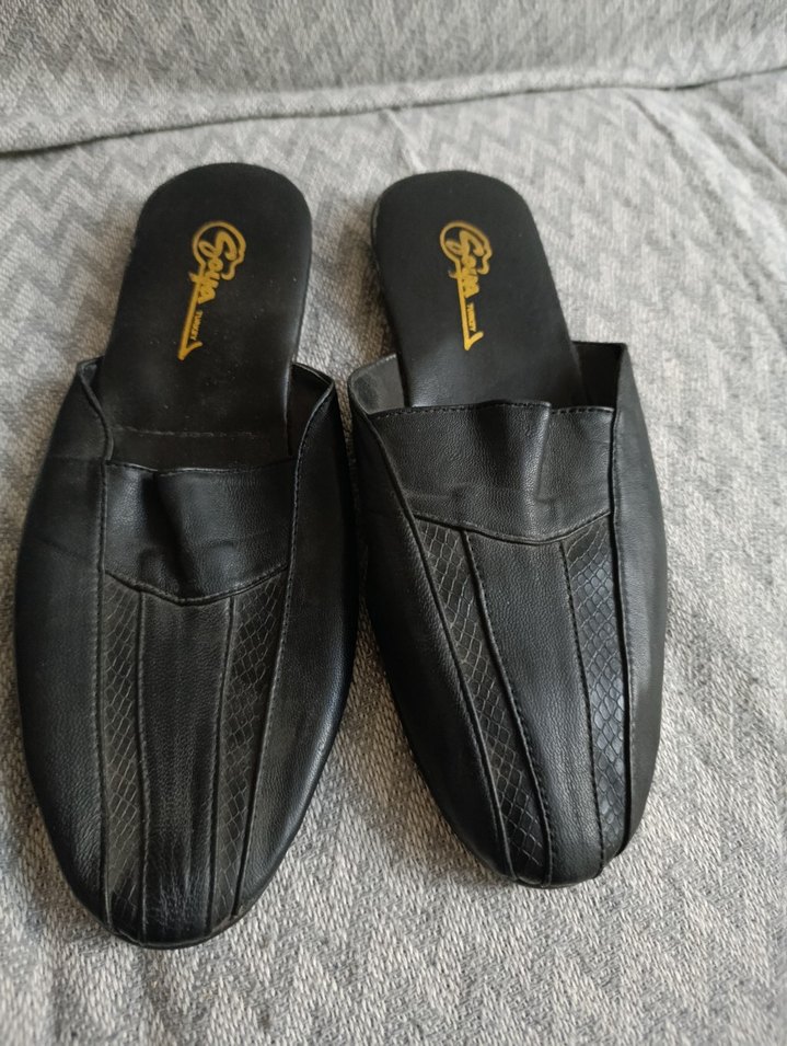 siyah renkli klasik erkek ev terliği. Rahat tasarıma sahiptir. damatlık terliktir. gerçek deri mi bilmiyorum ama, altı hakiki kösele taban ve sıfır ürün hiç kullanılmadı.. damat bohçasında durdu hep. ihtiyaç fazlası
