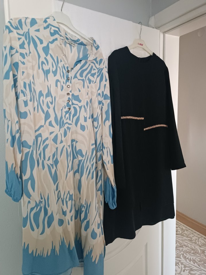 Düğmeli, yüksek yakalı, uzun kollu, açık mavi desenli, pamuklu kumaş ikisinin fiyatı