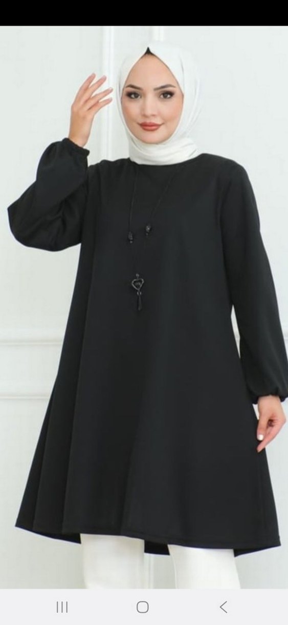 Siyah uzun elbise, yüksek yakalı ve uzun kolludur. Salaş kesimi ve ipeksi dokusuyla günlük kullanıma uygun minimalist gotik tarz sunar.