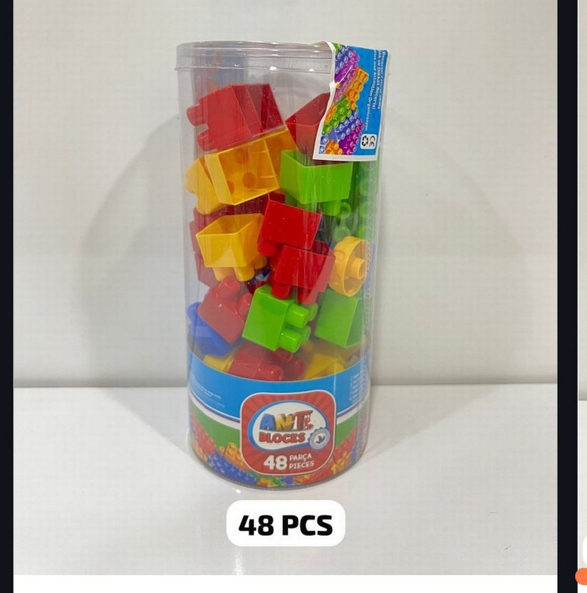 48 parçadan oluşan renkli Lego blok seti, çeşitli şekillerde ve şeffaf silindirik kutuda sunulmuştur. Yaratıcı oyun için uygundur.