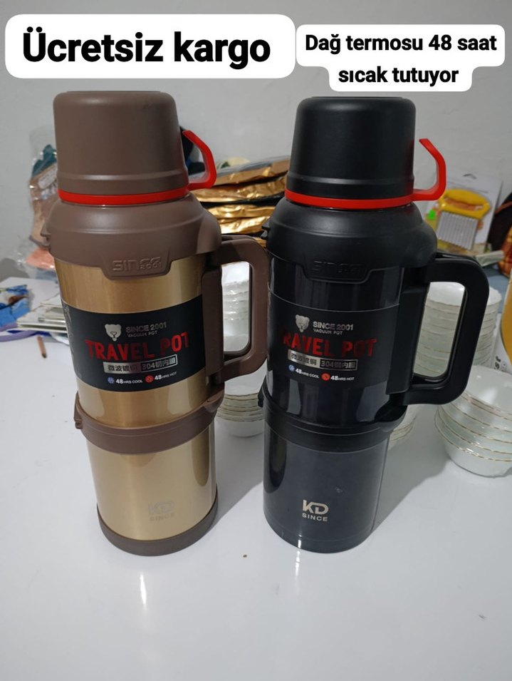 48 saat boyunca içecekleri sıcak tutan, saplı kahverengi ve siyah dağ termosu. 4 litre