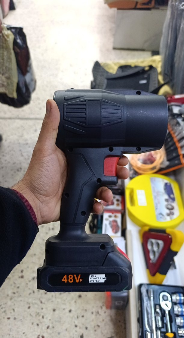 48V güç sistemine sahip siyah kablosuz üfleme makinesi çeşitli ev işleri için uygun. Kompakt ve kullanımı kolay.