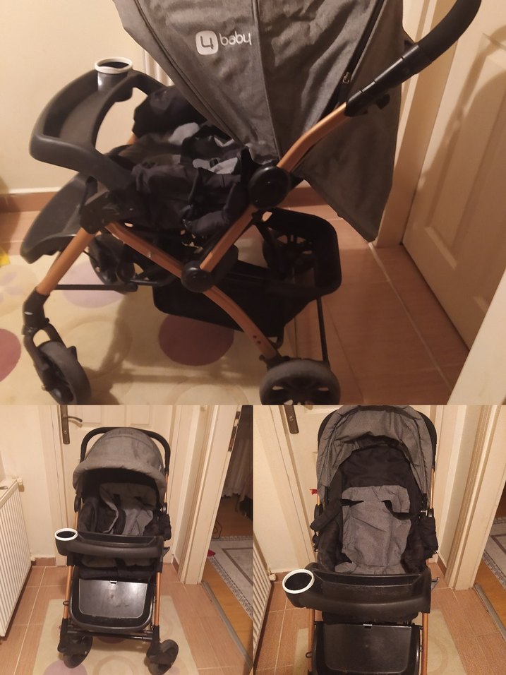 4Baby marka, gri tente ve kahverengi iskeletli bebek arabası. Bardak tutucu ve alt sepet bulunur. Dayanıklı tasarım ve kullanışlı özelliklere sahiptir.