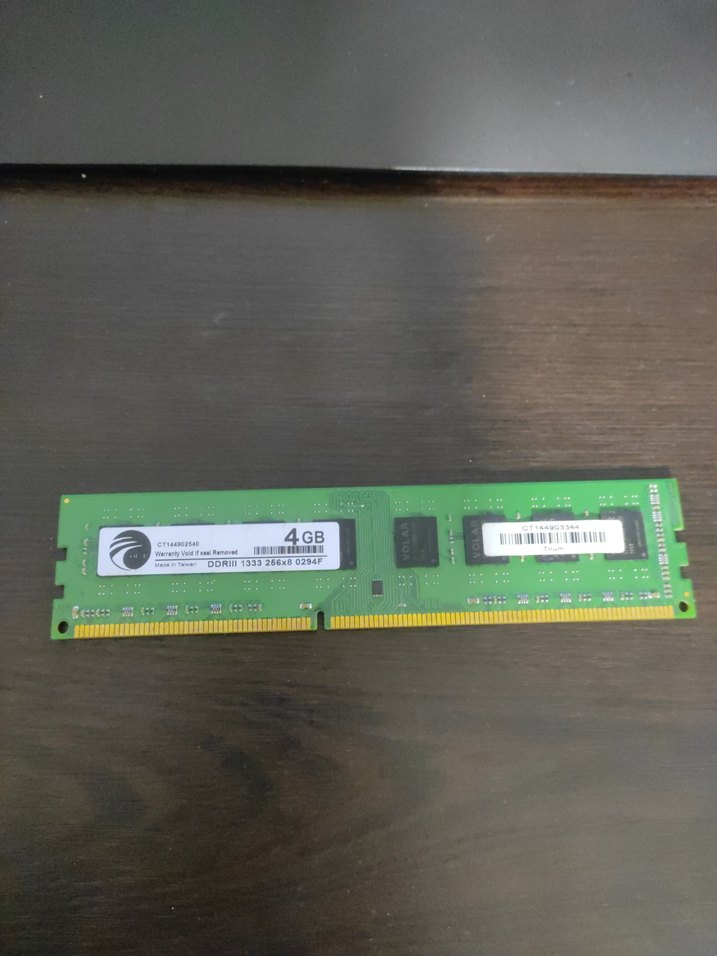 4GB DDR3 RAM bellek modülü, 1333 MHz hızında, masaüstü bilgisayarlar için uygundur. Koyu yeşil PCB ve standart DIMM formunda.