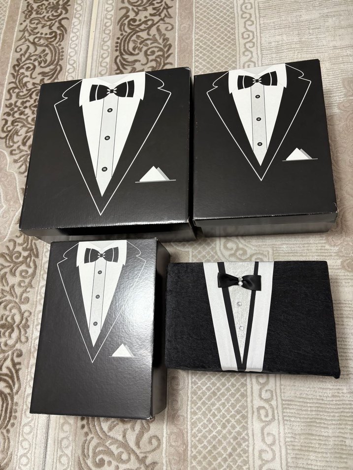 Siyah vintage tarzda, klasik düğün temalarına uygun papyon ve mendil baskılı mini damatlık kutuları.