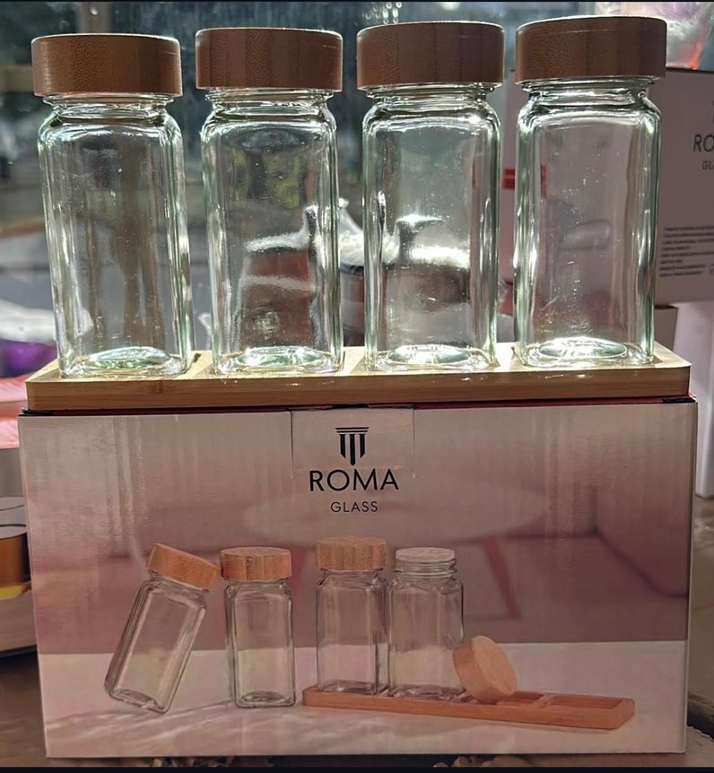 Roma Glass markalı, bambu kapaklı ve sade cam baharatlık seti, altlıklı şık ahşap raf üzerinde düzenlenmiştir.
