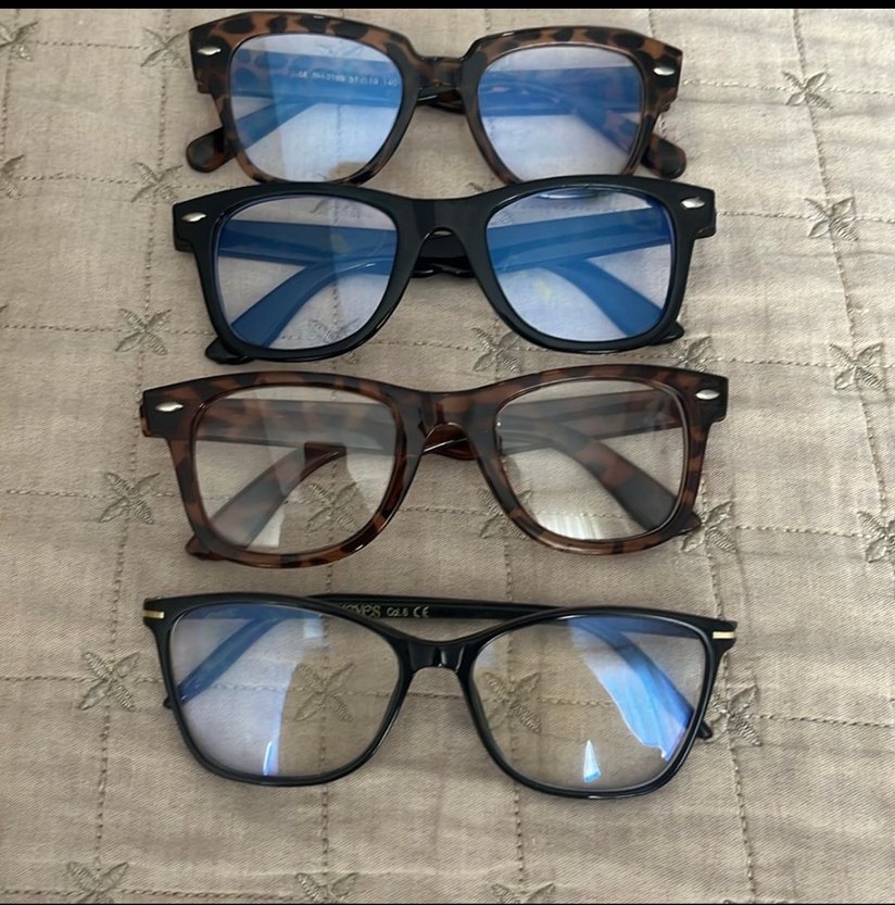 Koyu mavi tonlarda, şeffaf camlı klasik kadın gözlükleri. Zamanın ötesinde, karşı kültür tarzı farklı çerçeve seçenekleri içerir.