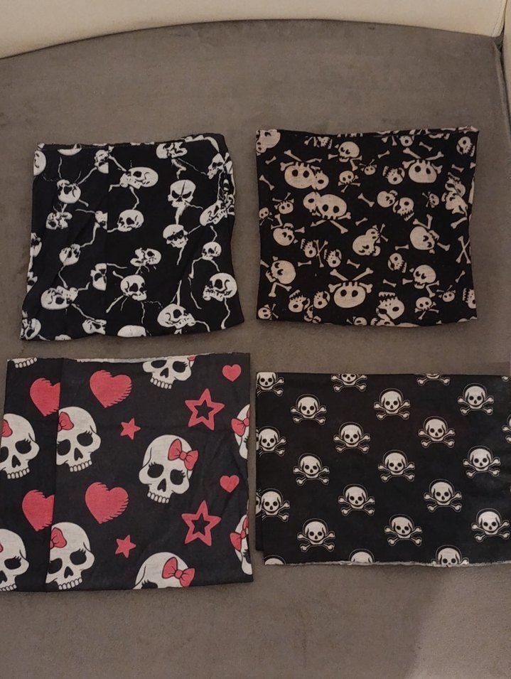 Kara zemin üzerine farklı kafatası ve kalp baskıları bulunanı,. Her birinde farklı desenler mevcuttur.