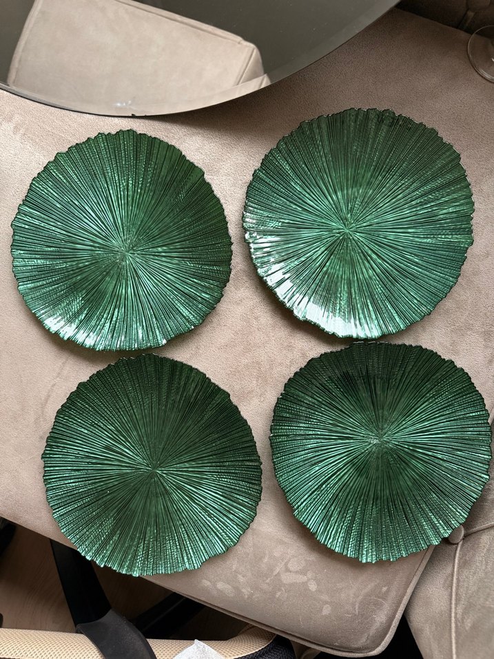 Parlak yeşil renkte, bohem tarzda, dokulu ve desensiz dört adet tabak seti. ️