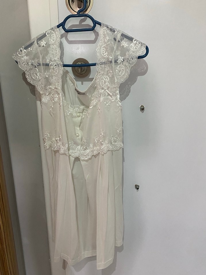V yaka, kolsuz ve bol kesim beyaz hamile geceliği, üst kısmında zarif dantel detayları bulunur. Midi boy ve açık renk. Alt üst takım bir kere giyildi gecelik ve sabahlık hiç giyilmedi herhangi bir lekesi defosu yoktur