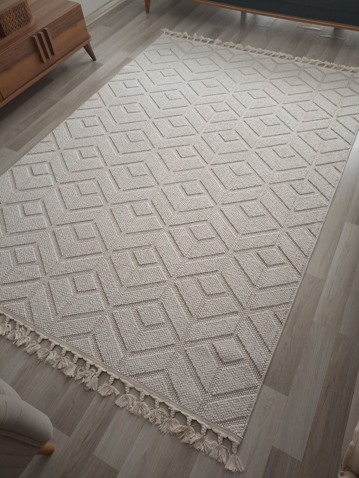 bej ve gri tonlarında, dokulu desenli ve püsküllü kenarlara sahip halı, mekana doğal bir hava katıyor.yeni aldım odama uyum sağlamadığı için satıyorum. temiz sıfır ayarındadr. bir yerinde küçük bir ip kaçması var onuda yakından çektim belli olmuyor aldığımda öyleydi onun haricinde sorunsuzdur
