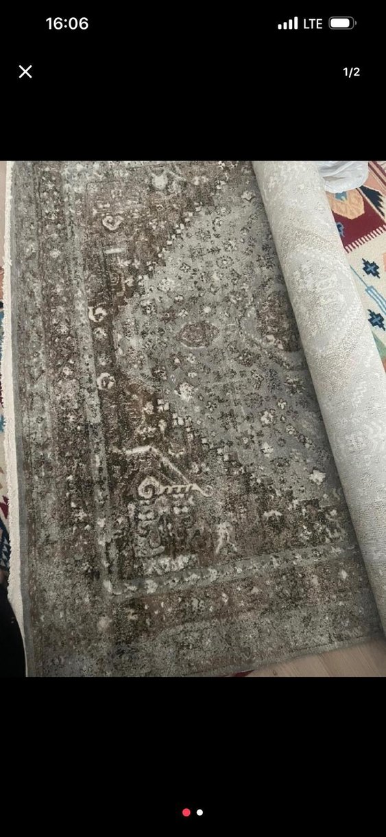 Bohem tarzı, kahverengi ve gri tonlarda desenli, yumuşak dokulu vintage görünümlü halı.