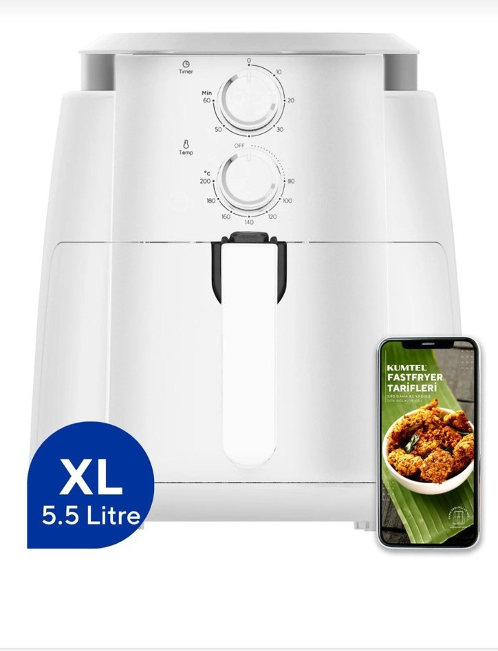 5.5 litrelik beyaz XL fritöz, ayarlanabilir zamanlayıcı ve sıcaklık kontrolüne sahiptir. Tarif uygulamasıyla birlikte gelir.