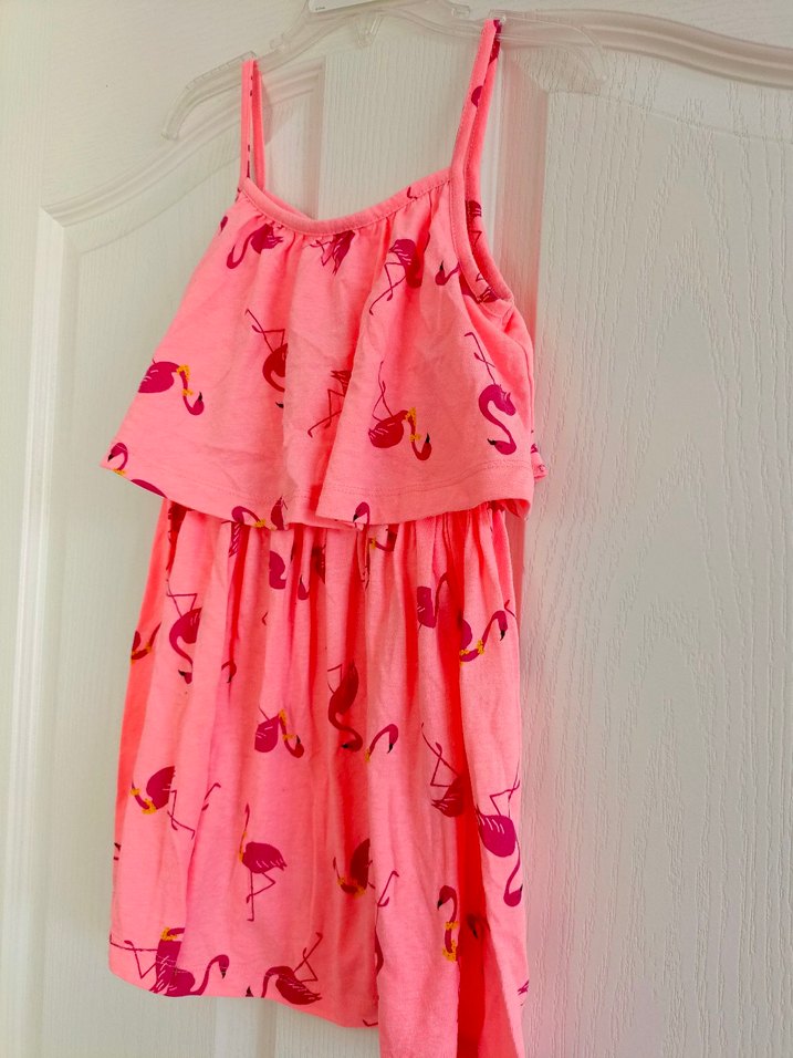 5-6 yaş LCW marka elbiseKız çocuk için askılı, straplez, fırfırlı detaylı, pembe flamingo desenli elbise. Rahat kesimli, yumuşak sentetik kumaştan, bohem tarzına uygun.