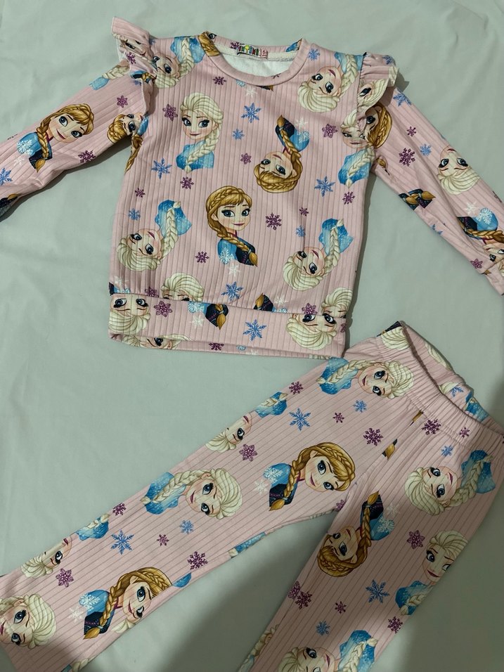 5-6 yaş Pastel pembe, baskılı frozen karakter desenli, uzun kollu ve örme kumaştan yapılmış çocuk kız takımı.