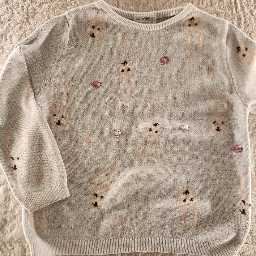 Bej renkli, uzun kollu ve yuvarlak yakalı kız çocuk kazak fotoğrafta göründüğü gibi fazlalıktan dolayı satılık