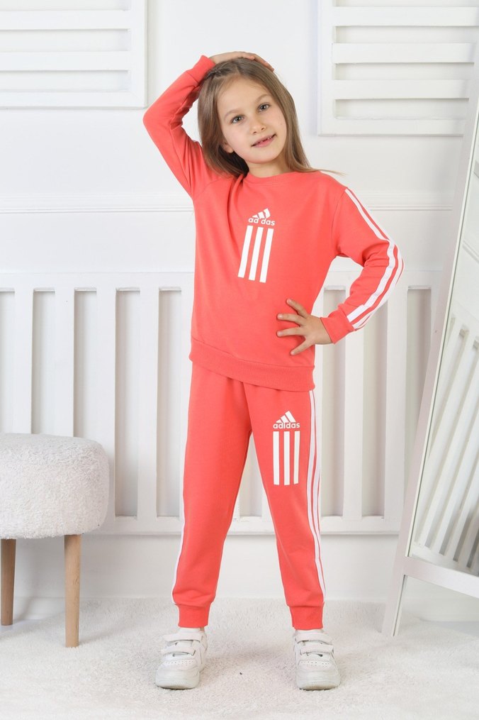 Renkli pembe kız eşofman takımı, bol kesim, uzun kollu ve bisiklet yaka. Yumuşak ve sıcak kumaştan, çizgili detaylarla normcore tarzda rahat ve şık.